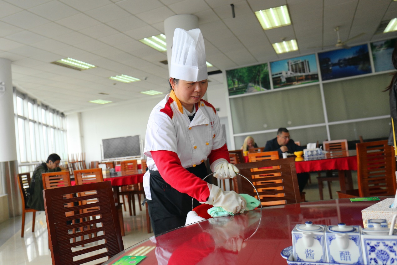 经管书院党委副书记王郦玉在食堂保洁岗清理餐桌
