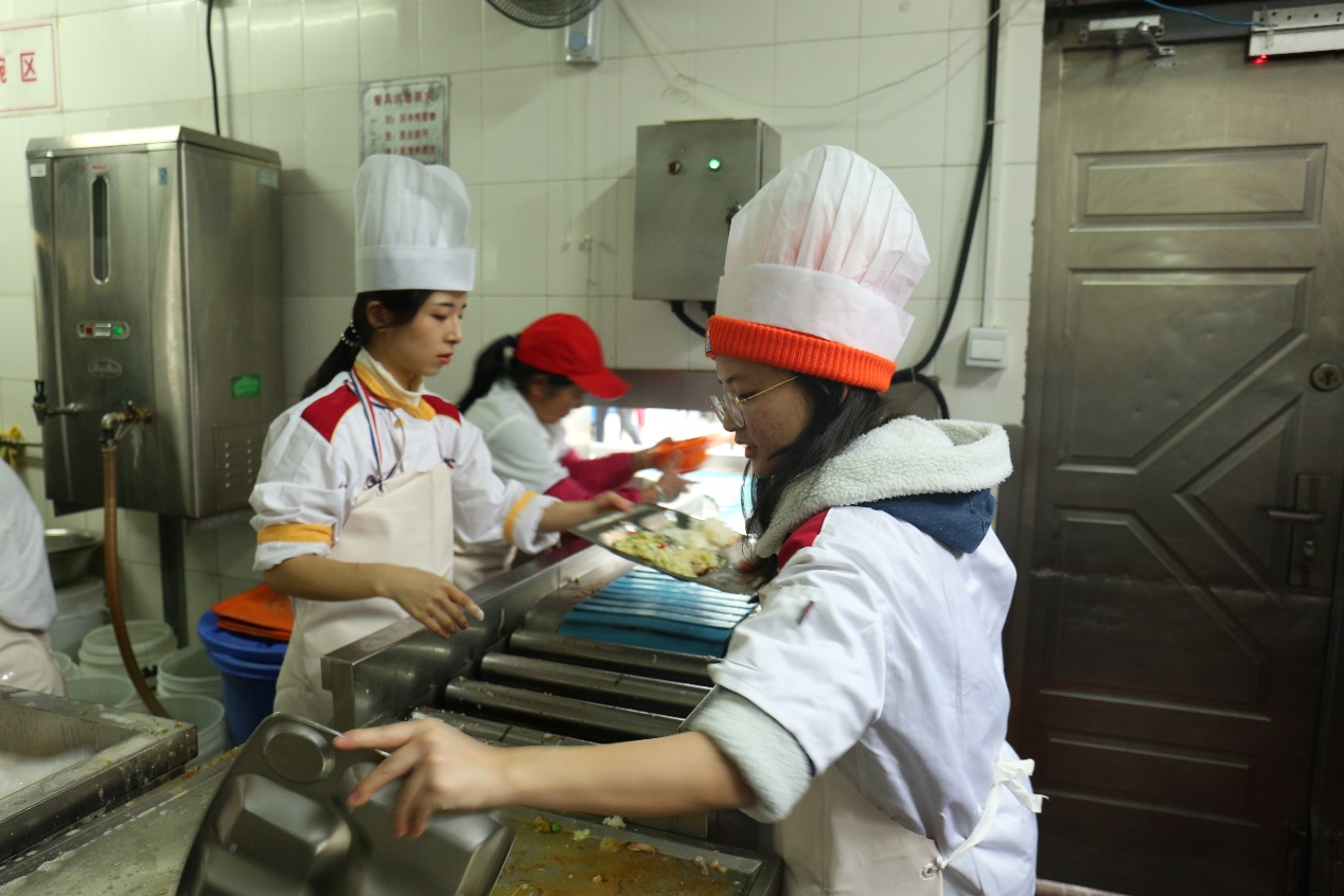 上午十一点整,膳食岗的师生党员们穿上了厨师服,戴上了厨师帽,在食堂的保洁岗就位,迎接“开饭”时间。午餐时段虽然短暂,但足以传递大家满满的劳动热情和为师生服务的喜悦。而在学校另一侧的学子驿站中,出库岗的师生正负责取件核实、拍照取证工作,分拣岗则负责快递包裹的分拣上架,并引导学生取件。