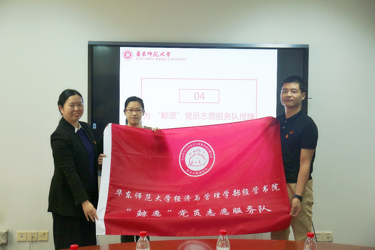 后勤保障部副部长毛云飞为经管书院“鲸愿”党员志愿服务队授旗