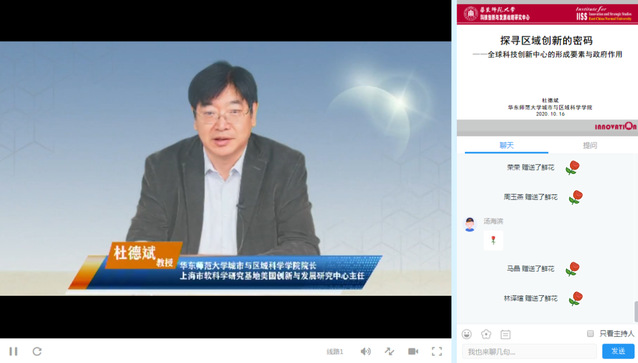 主题周中,华东师范大学地球科学学部副主任、城市与区域科学学院院长,教育部战略研究基地创新战略研究中心主任,上海市软科学研究基地美国创新与发展研究中心主任,上海市人民政府决策咨询研究基地杜德斌工作室首席专家杜德斌教授的讲座题为《探索区域创新的密码:全球科技创新中心的形成要素与政府作用》。他基于以往的国际、国内科技创新活动研究成果,结合目前国际、区域科技创新发展现状,从大国竞争的本质、科技创新中心的重要性、科技“引擎”企业的拉动作用等方面,深入浅出地解读了区域创新的“密码”。他强调,包容性是创新文化的核心价值,形成“宽容失败,激励草根,包容异质”的文化环境是推动区域创新的先决条件;创新人才积累是建设科技创新中心的本质,借助世界级一流大学的培养、集聚作用,打造创新人才高地,为区域创新发展提供“燃料”,是打造科技创新中心的重中之重;“引擎”企业是技术快速发展的主体力量,通过政府政策引导、基础条件建设等手段,积极播种、培育本土“引擎”企业,是拉动区域科技创新的长久动能。