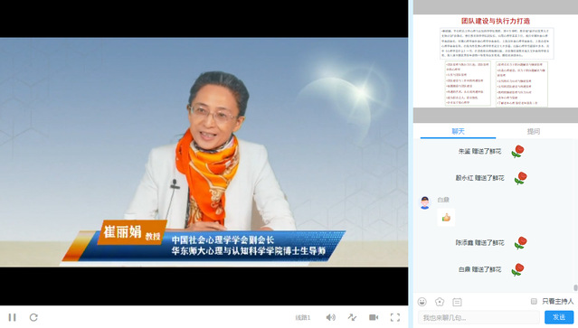 中国社会心理学学会副会长、教育部“新世纪优秀人才支持计划”获得者、华东师范大学心理与认知科学学院应用心理学系崔丽娟教授的讲座主题为《从心理学看管理:团队建设与执行力打造》。她从心理学角度,深入剖析了管理中普遍存在的团队建设和执行力打造的常见问题和误区,提出心理学与管理的“道术结合”,强调了团队建设需要基于个体、群体、文化、时代等方面的差异进行适应性的调整,同时要充分挖掘核心成员需求,转换视角用“心”稳定队伍,准确识别团队成员优势劣势,因才用人发挥人之所长。针对团队的执行力打造,崔丽娟教授结合管理实例介绍了反馈、考核、分配等方面的实用性技巧。最后,她总结到,“优秀的团队建设者要集政治家、经济学家、教育家于一身”,也寄希望同学们能够结合心理学知识,做好团队的建设者、管理者、领导者。