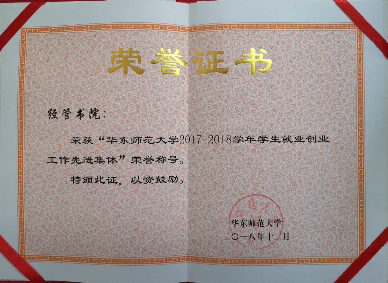 书院就业创业工作由经管书院党委书记亲自指导、副院长分管、专职就业创业辅导员具体执行,从机构设置与人员职责、从促进措施到激励机制,多管齐下,立足于学生的需要,分类开展就业创业指导,强化校企合作,构筑起院系、师生、企业三方联动机制,取得了较好的成效,于2018年再次荣获华东师范大学2017-2018学年学生就业创业工作先进集体称号。