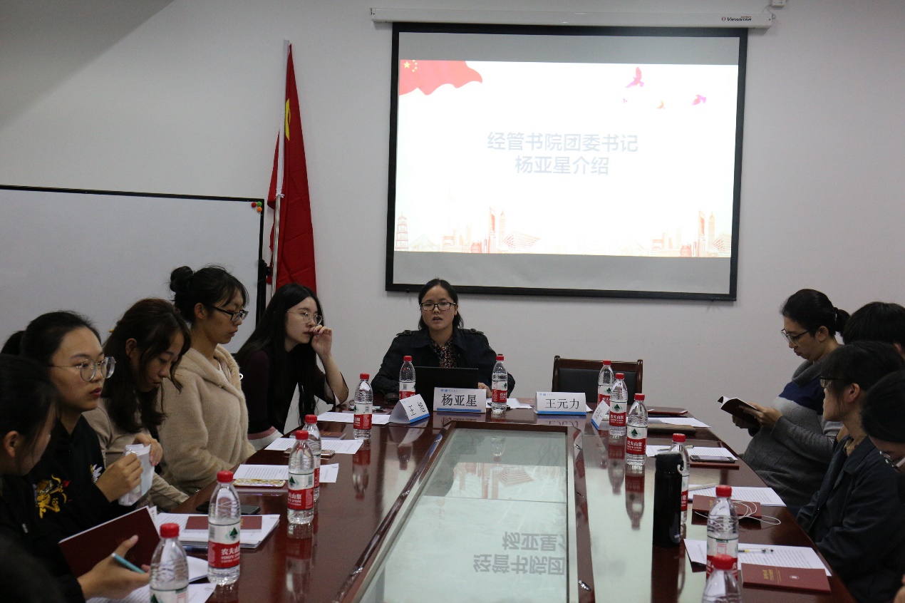 会议在热情激昂的《光荣啊,中国共青团》中拉开序幕。杨亚星首先介绍了有关《社会实践:中国社会实践与体验》课程的概况,该课程分为日常社会实践与主题社会实践,日常社会实践由团委组织部负责,主题社会实践由团委社会实践部负责,书院团委建议团支书以团日活动为依托带领团员们开展日常社会实践活动并形成实践基地学习体会,各团支部需在本学期完成2次及以上日常社会实践活动。之后,杨亚星又介绍了主题社会实践活动,详细说明了主题活动内容以及开展实践活动的组队要求,学生确立实践主题后,可依托班级、团支部或自主组成实践团队,最终完成实践报告。