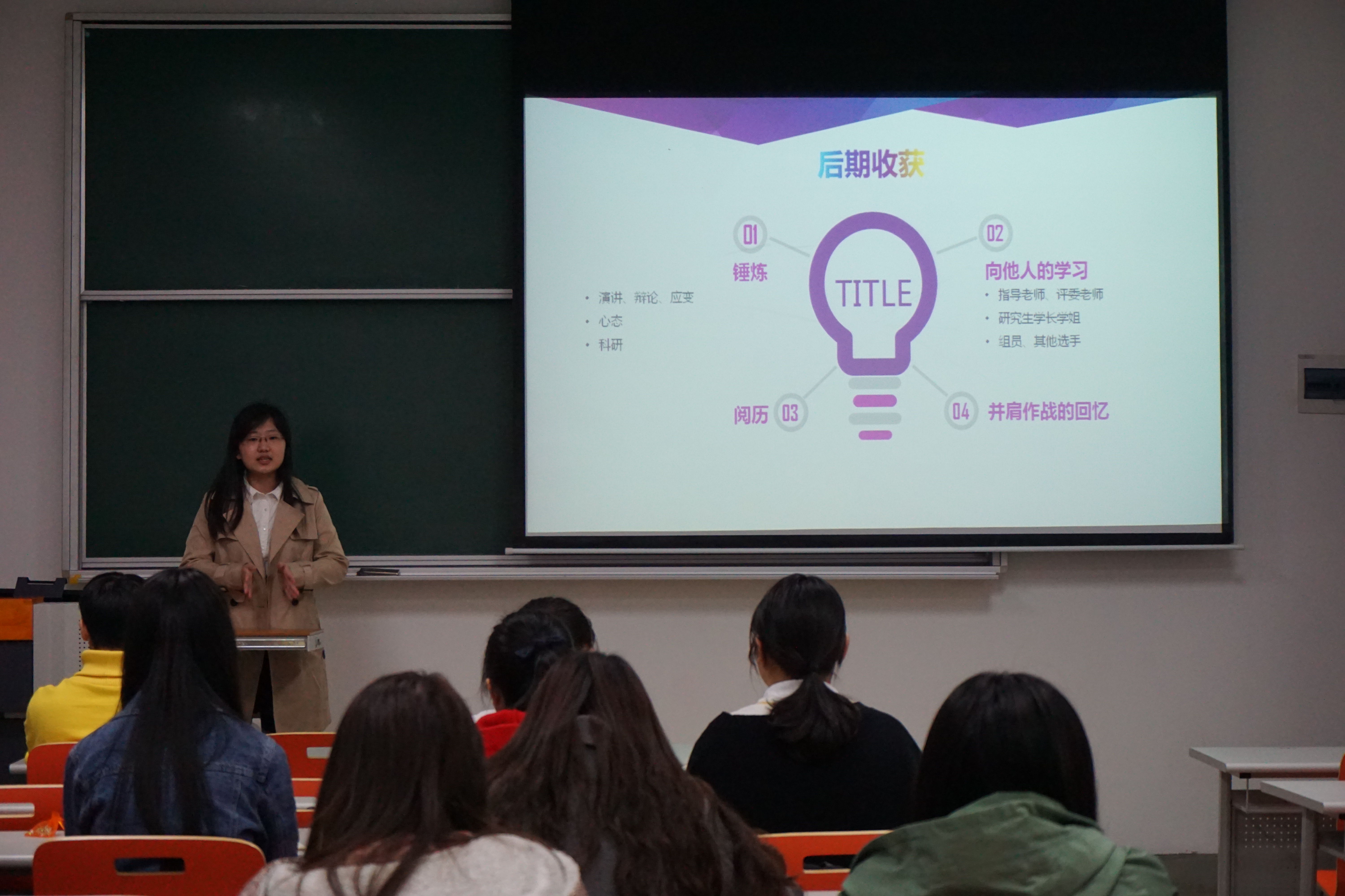 朱姚情从赛事安排、参赛动机、前期准备和后期收获等几个方面为在场同学做了分享,她认为学科竞赛能极大开拓大家的眼界,帮助结识到很多志同道合的人。同时,投入到学科竞赛中可以锤炼意志、增长阅历,获得向他人学习的机会,收获并肩作战的回忆,更能为学业助力。她还提到,无论是在比赛中还是在生活中,都要注重细节、提高效率,表现出公管人的精神风貌。
