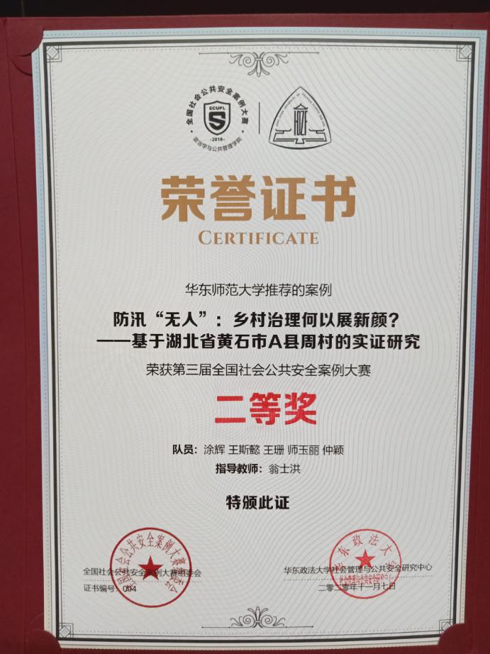 此次大赛吸引了来自上海交通大学、四川大学、电子科技大学、中国政法大学等国内著名高校的百余支本科生及研究生队伍参加。在历时四个月的扎实调研和案例写作后,我校经管学部不同专业学生联合组建的团队表现亮眼,成功闯入20强决赛。在公共管理学院翁士洪、谢炜、王法硕、李悦等诸位老师的精心指导下,团队的案例《防汛“无人”:乡村治理何以展新颜?——基于湖北省黄石市A县周村的实证研究》荣获第三届全国社会公共安全案例大赛二等奖。
