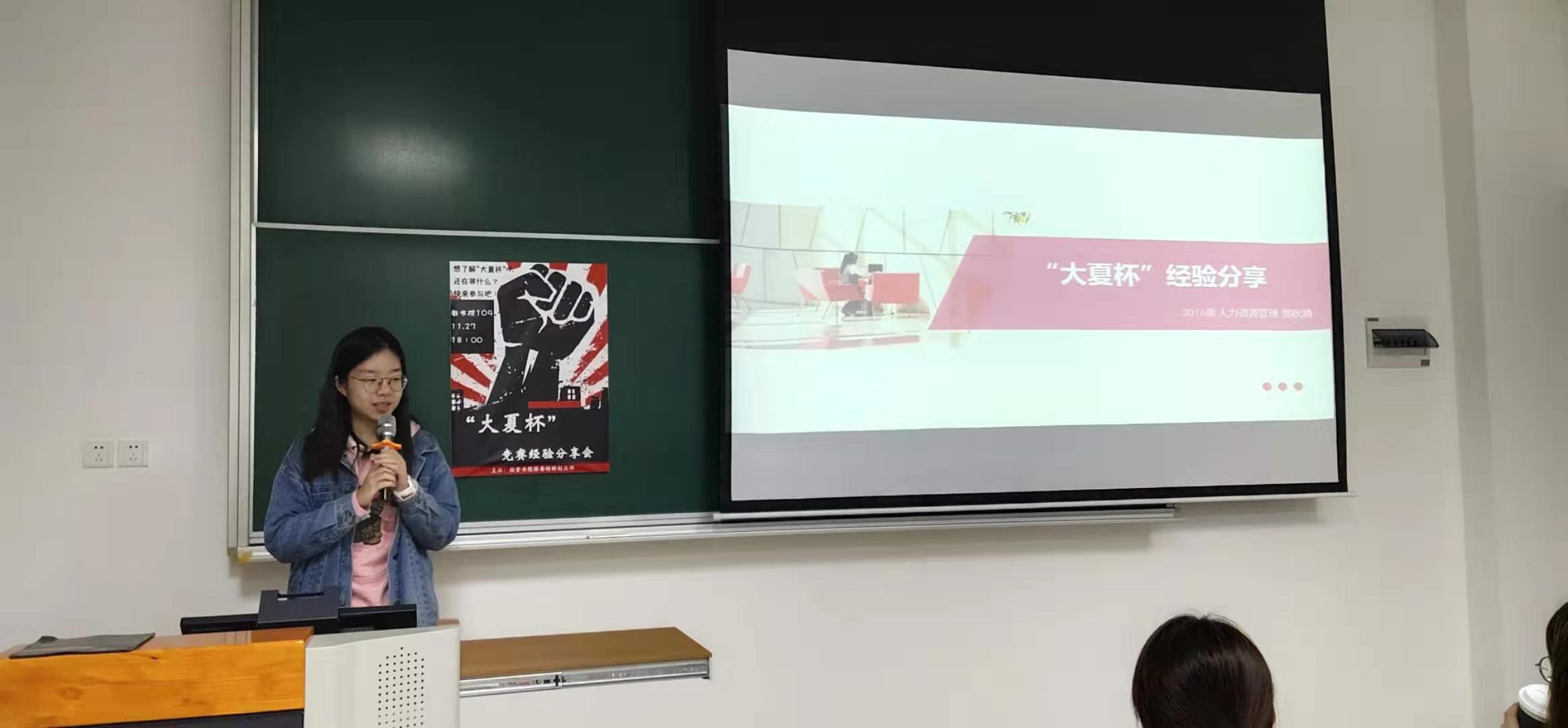 2016级人力资源管理专业本科生郭秋渔首先介绍了“大夏杯”系列比赛的类别和备赛时间节点,并从文献研究、定量分析、分工协作、效率管理等角度作了详细讲解。