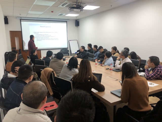 樊海潮教授介绍了中国加入WTO带来的国际贸易政策的不确定对企业排放污染物(二氧化硫)水平的影响。他及其合作者通过建立模型和实证分析,说明国际贸易政策的不确定性对企业污染排放的影响取决于是否存在污染总量的限制。研究结论为贸易政策不确定性下降增加了企业产出,但是只在有污染总量限制的地区会出现企业减少二氧化硫的强度及用量。二氧化硫排放量下降的原因渠道有两个:化石燃料使用量的下降和更多地使用环境友好型生产工具。此外,当环境污染总量限制存在时,贸易政策不确定性下降会提升企业的生产效率。