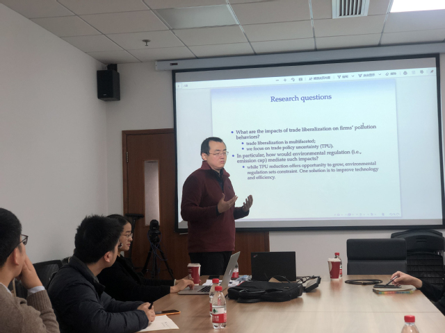 2020年12月1日上午,大宏观科研团队学术讲座系列第四十六期在理科大楼A1414会议室顺利举行。本次讲座邀请复旦大学经济学院樊海潮教授做了题为“Trade Uncertainty and Firm Pollution”的主题报告,讲座由经济学院胡一川老师主持,经济与管理学部近三十名师生参加了讲座。