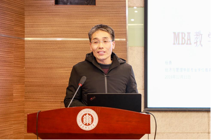 专业学位教育中心副主任杨勇教授首先就2019年MBA教学与学位工作向与会教师进行了汇报,重点就本学期课程教学自查自纠工作的进展情况进行了充分的交流。他表示,感谢长期以来各位老师对MBA教学与学位工作的支持,才得以收获了学生们的高度肯定,并鼓励教师积极参与中心后续双语/全英文课程与选修课程建设等项目的开展。