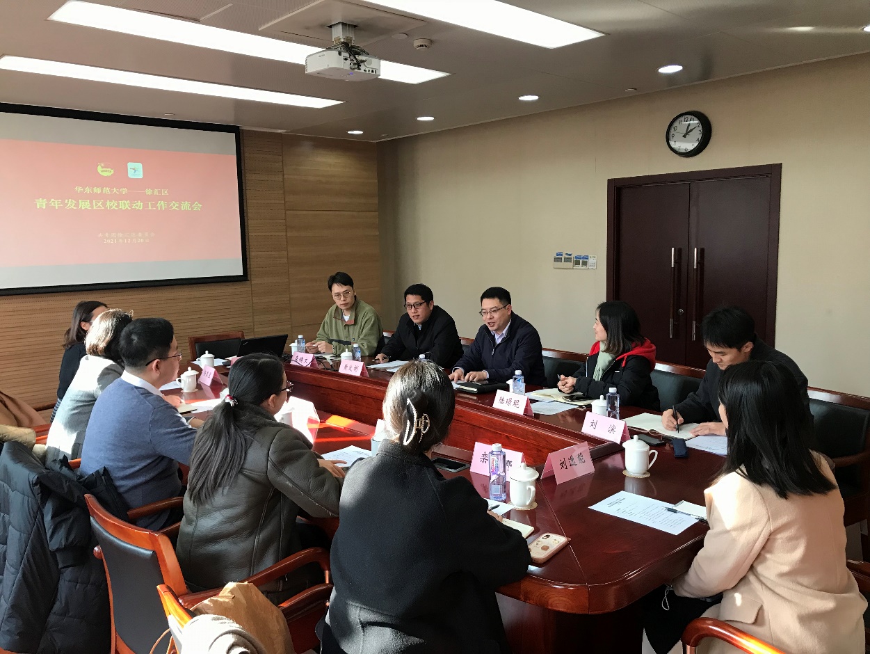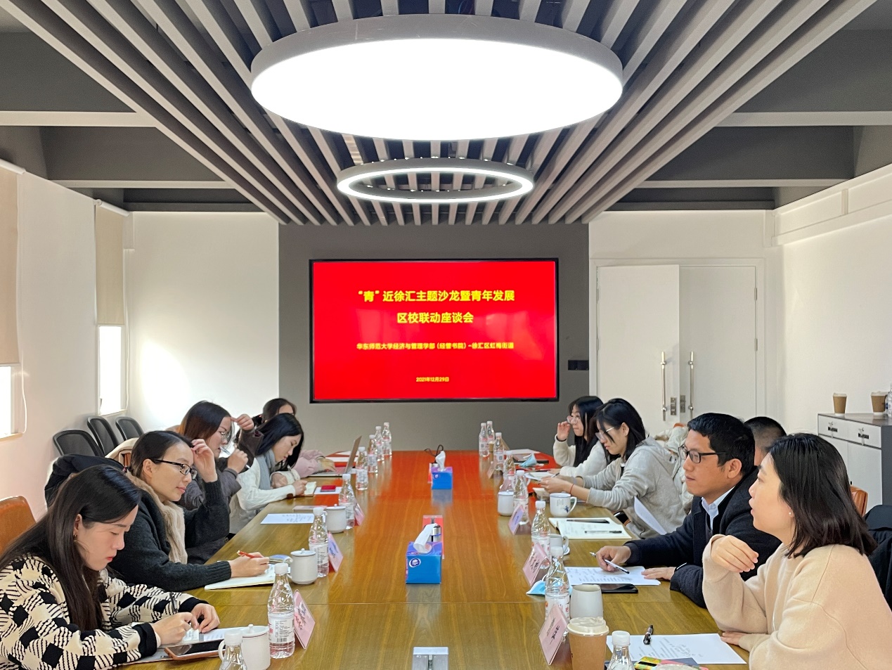 2021年12月20日下午,“华东师范大学——徐汇区 青年发展区校联动工作交流会”在徐汇区政府3号楼第五会议室举行。徐汇区委组织部副部长、公务员局局长申毅,徐汇团区委书记陆璟琨,徐汇团区委副书记黄文彬,徐汇区委组织部公务员一科科长刘滨,徐汇团区委基层工作部副部长龚镛文,徐汇团区委基层工作部储备人才康贝尔,我校选调生工作办公室副主任、党委学生(研究生)工作部副部长章晶晶,经济与管理学部(经管书院)党委副书记张艳虹,校团委副书记张静,经济与管理学部(经管书院)团委书记杨亚星,经济与管理学部(经管书院)团委副书记栾赛娜、刘逸能参与交流。