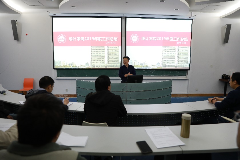 张日权首先对学院的领导班子、党支部和各位老师这学期的辛苦付出表示感谢。接着,他从重要成果、主要活动、文化建设、其他等四个方面对2019年度学院整体工作进行了全面、详细的总结和汇报,他表示,我们取得这样丰硕的成果离不开各位老师的大力支持和帮助,希望大家继续团结、努力,一如既往的支持学院的工作。最后,他汇报了2020年学院工作计划:加强人才引进,并注重学院内人才培养;迎接双一流评估;制定重点实验室4年长期规划和每年短期规划;推进一流专业建设;打造统计名师;进一步提升教学质量;加快英文期刊建设;建设统计学科数据库;加强学科文化建设;加大落地项目的实施;培育统计类国家重点项目和重大研究计划;加强教学科研综合团队建设;加大国内外研究生招生宣传力度;把关毕业生论文、杜绝学生学术不端行为;加强学院领导班子和党支部内部建设。