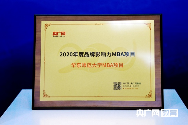 2020年12月3日,2020年度央广网教育峰会在京举行。本次教育峰会以“乘风破浪 聚教未来”为主题,邀请教育行业知名专家、学者、名师,针对多个热门话题展开讨论,为传播先进教育教学理念献计献策。峰会上公布了多个2020年度教育榜单,华东师范大学MBA项目荣获“2020年度品牌影响力MBA项目”,与清华大学经管学院MBA项目、北京大学光华管理学院MBA项目、同济大学经济与管理学院MBA项目等同获此奖。