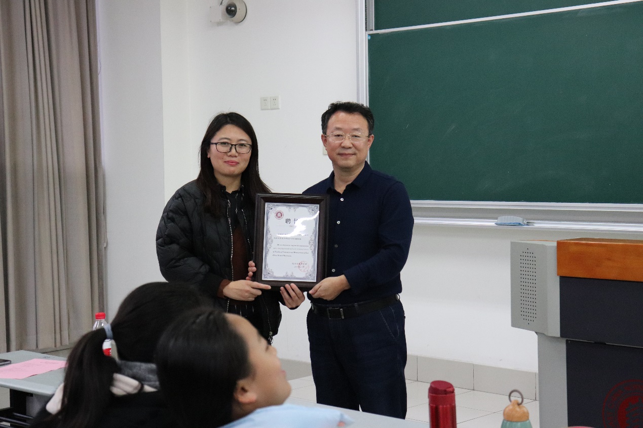 接下来,在同学们的阵阵掌声中,张日权教授从金丽君副院长手中正式接过了班主任聘书,成为2018级统计大类的班主任,成为了统计学院本科生的首位班主任老师,也是经济与管理学部第一位担任本科生班主任的学院院长。