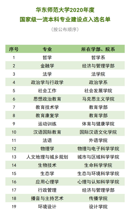 近日,教育部办公厅正式公布了2020年度国家级和省级一流本科专业建设点名单。华东师范大学19个专业入选2020年度国家级一流本科专业建设点,其中,经济与管理学部金融学、行政管理专业双双入选。