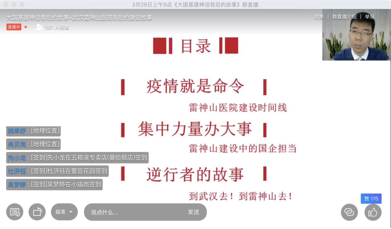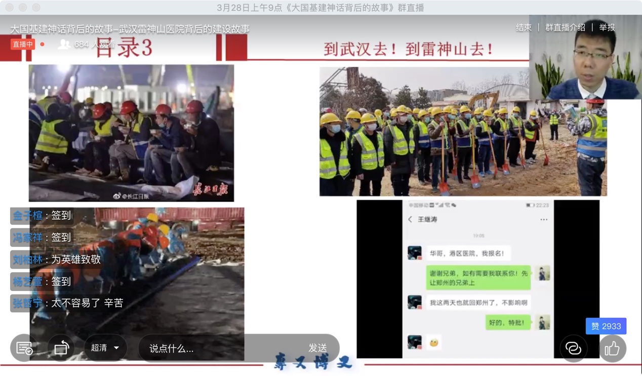 3月28日上午,公共管理类本科生党支部全体党员“云”出席“共抗疫情、爱国力行”爱国主义主题教育讲座,共同聆听浙江大学博士生报告团、浙江大学建筑工程学院市政工程研究所王华庆博士带来的《武汉雷神山医院背后的建设故事》。公共管理类本科生党支部书记、经管学部关工委分会副秘书长杨亚星同志主持活动;经管学部关工委副主任、特邀党建组织员陈爱平老师应邀聆听。