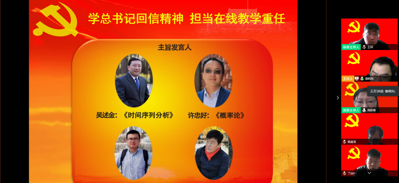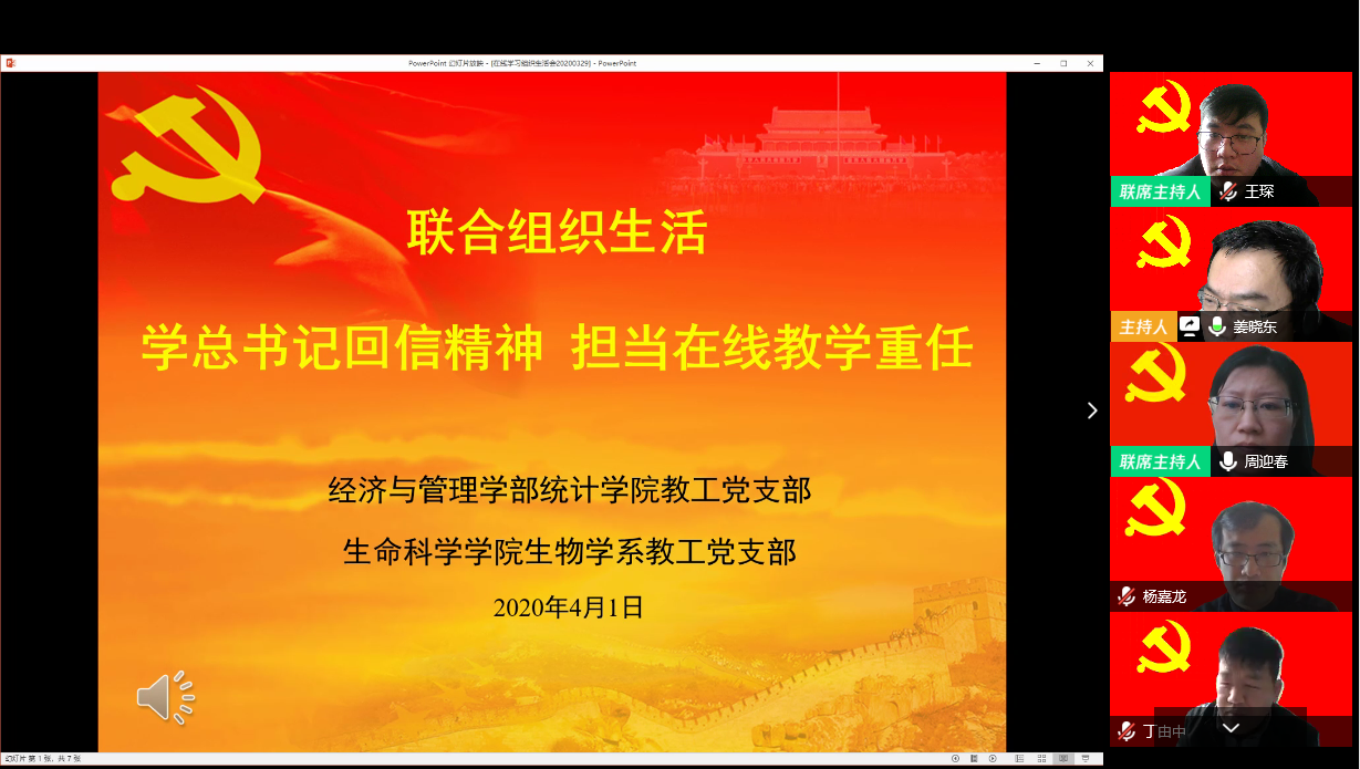 4月1日下午,经济与管理学部统计学院教工党支部与生命科学学院生物学系教工党支部开展主题为“学总书记回信精神,担当在线教学重任”的线上联合组织生活。会议由统计学院教工党支部书记周迎春和生物学系教工党支部书记姜晓东共同主持,两支部60余名党员参会。