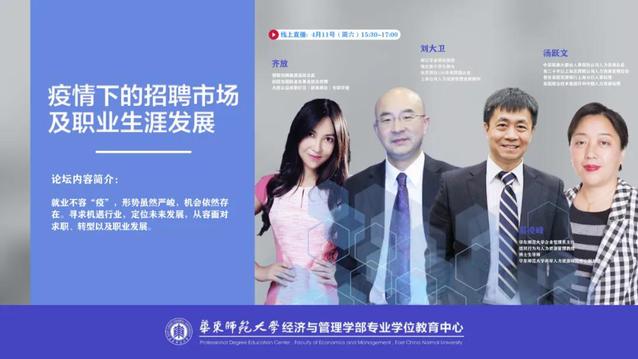 A forum on the recruitment market and career development during the pandemic was specifically staged. Four guests were invited to discuss employment issues online and answer questions from this year’s graduates about job-seeking. They were Prof. Yi Lingfeng, Director of ECNU’s Department of Enterprise Management, Mr. Liu Dawei, a chair professor of Minjiang Scholars, Ms. Tang Yuewen, supervisor of Human Resources of U.S. MetLife Insurance Company, and Ms. Qi Fang, senior supervisor of Zhilian Recruitment Group.