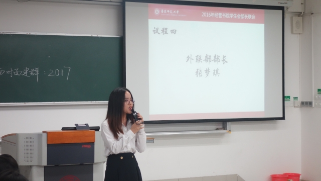 最后,朱雅洁做了本学期学生会工作总结。她从部长的职责定位出发,强调了活动设计要从学生需求出发,实现服务学生的目的;接着又以“经管人的素养需要如何体现”为题,介绍了沟通在学生工作中的重要性。