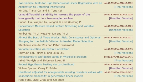 统计学国际知名期刊《Statistica Sinica》在线发表论文