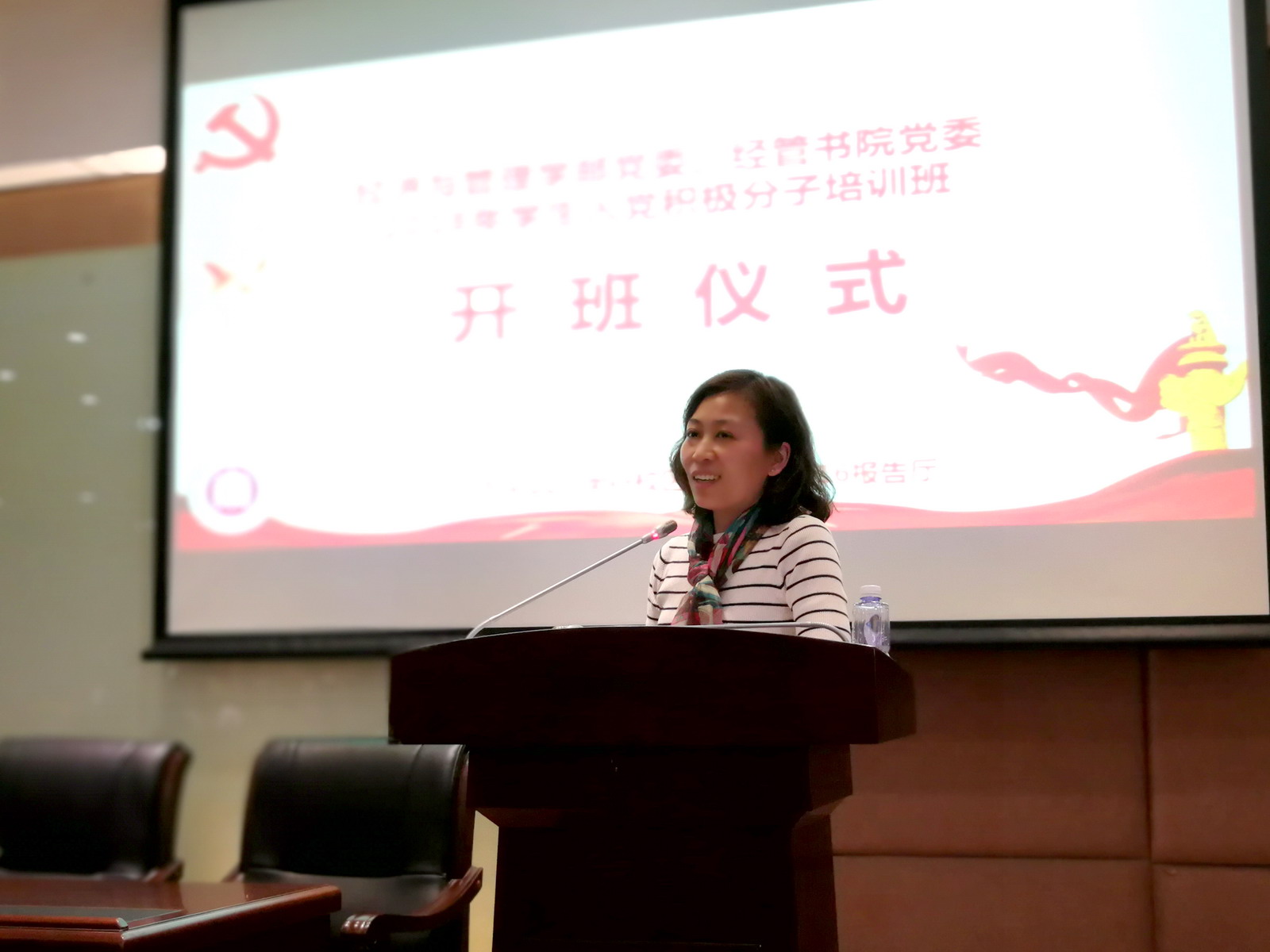 开班仪式上,经管书院党委副书记董盈盈介绍了本期培训班的基本情况和学员构成,鼓励来自不同年级、不同专业的学员们充分利用培训班这个跨学科交流平台,互相学习,碰撞思想,携手共进。她向在座学员们提出了三个问题,一是你入党的初心是什么?二是你心目中合格的党员形象是怎样的?三是如何才能在思想上和行动上向党组织靠拢?希望大家能够通过培训班的学习提升思想理论水平,进一步端正入党动机,积极向党组织靠拢,在学习和生活的方方面面以党员的标准严格要求自己。