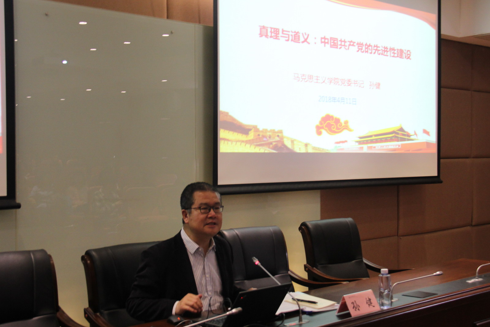 马克思主义学院党委书记孙健以“真理与道义——中国共产党的先进性建设”为题作专题辅导第二讲。他首先强调先进性是马克思主义政党的根本特征,也是马克思主义政党的生命所系、力量所在,党的先进性建设是马克思主义政党自身建设的根本任务。随后,他从三个方面来谈先进性,分别是对中国共产党先进性内涵的基本认识(先进性建设的必要性)、加强中国共产党先进性建设的原由与目的(先进性建设的紧迫性)、党员要做保持党的先进性的维护者和践行者(先进性建设的实践性)。他介绍了政党及其功能,向学员们解释先进性是一个比较概念和一个价值评价范畴,涉及不同的对象和比较标准,而政党的先进性主要表现为理论理念、阶级基础、构成成员、组织制度、利益代表和实践行为的先进性。中国共产党先进性立足于真理与道义两大基点,中国共产党现阶段保持和发展先进性的时代背景是基于世情、国情和党情的变化,他强调,加强中国共产党的先进性建设,保持党的先进性,关键是每一位党员要牢记党的宗旨和使命,不忘初心,保持自身的先进性。