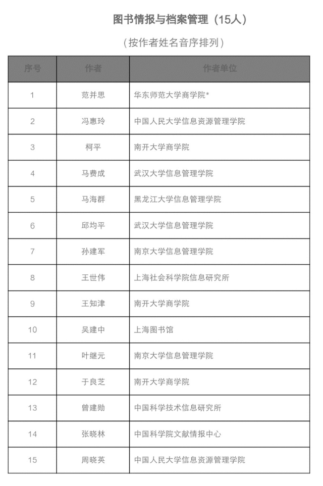 “复印报刊资料”是我国最为重要的学术文摘之一。本次公布的《复印报刊资料重要转载来源作者(2016版)》由中国人民大学人文社会科学学术成果评价研究中心联合中国人民大学书报资料中心研制,来源作者筛选依据2013- 2015三个年度的复印报刊资料学术刊的全文转载数据,作者学科分类依据所转载文章的主要学科归类确定。经统计,我校共11位教授入选该榜单,入选图书情报与档案管理学科榜单来源作者的前15位学者中,有5位均出自我校信息管理系及其前身,包括范并思、马海群、王世伟、吴建中和于良芝等几位在我国享有盛誉的情报学家或图书馆学家。