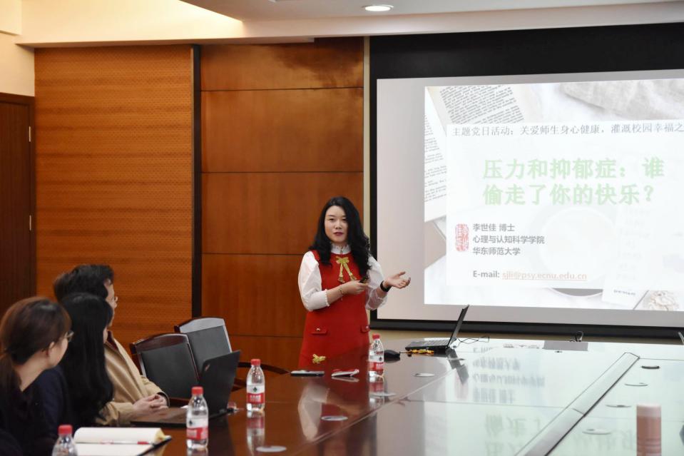 首先,心理与认知科学学院李世佳博士为大家做了“压力和抑郁症:谁偷走了你的快乐?”主题报告。李世佳老师从科学研究的角度探讨了生活中一些常见压力对身体、尤其是大脑的影响,然后着重科普了抑郁症的生物学和心理学研究进展,以及应对抑郁症的方法。在报告中,李世佳老师向大家深度剖析了慢性压力与急性压力,建议大家善用急性压力,释放慢性压力;随后,李世佳老师的报告进入到了第二部分——抑郁症,她为大家一一阐释了抑郁症到底是什么,什么导致了抑郁症,以及抑郁症是如何改变人们大脑的;最后,李世佳老师用世界卫生组织官方抑郁症宣传片结束了此次报告,号召在座教职工用科学态度战胜对抑郁症的偏见。