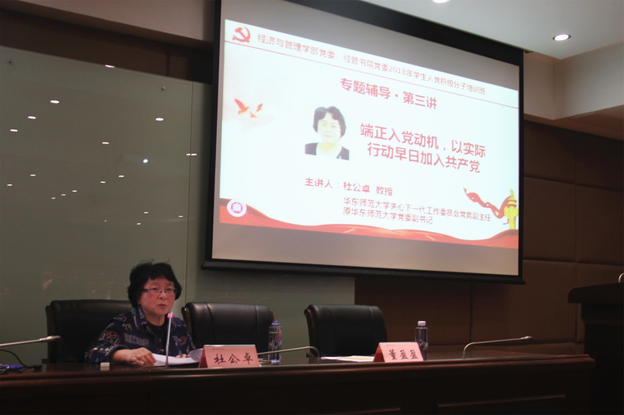 2018年4月18日下午,经济与管理学部党委、经管书院党委2018年学生入党积极分子培训班(经管3期党校)在闵行校区法商南楼516报告厅举行专题辅导第三、四讲,华东师范大学关工委常务副主任、原华东师范大学党委副书记杜公卓教授,华东师范大学党校副校长、高级研修学院副院长张俊华副教授分别担任主讲,经管书院党建办公室主任陈夏阳主持。
