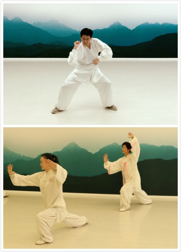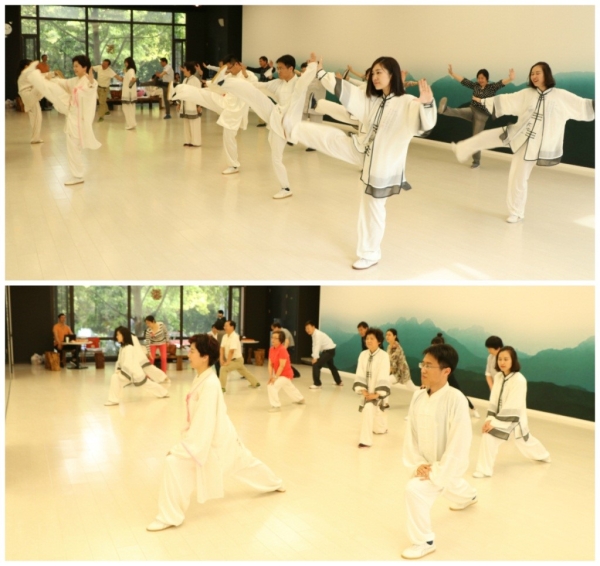会所的太极拳演练大厅极具禅意——巨幅远山风景影像让修炼者如立于天地之间,能达到天人合一的练功境界。老师们迫不及待地要求进入太极体验。信息系候经川教授率先亮相为大家展示了一套自己多年养生之陈式太极拳,臻太极会员们也为大家展示了杨式太极,他们的表演一招一式如行云流水,延绵不断、舒展大方引得场下掌声连连。