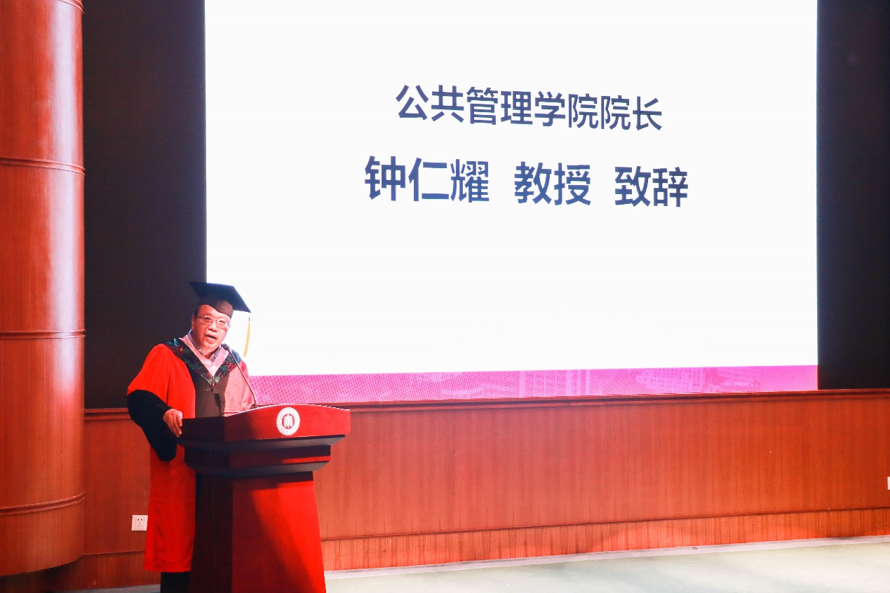 毕业典礼首先由公共管理学院院长钟仁耀教授致辞。他祝贺毕业生圆满完成学业,同时叮嘱毕业生要追求卓越,拒绝平庸;志存高远,敢于担当;脚踏实地,心怀感恩。最后,他希望:“无论毕业生将来飞得多高、走得多远,都能够多回家看看。”