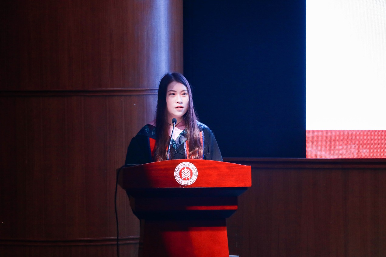 2014级人力资源专业本科生陆诗怡作为本科生代表发言。她提到四年的时光稍纵即逝,尽管有不舍,也要满载着同窗情谊与专业学识,开辟属于自己的天地,奔赴自己的未来。她代表全体毕业生感谢公共管理学院的全体老师,并激励全体毕业生要继续努力耕耘,不负韶华。