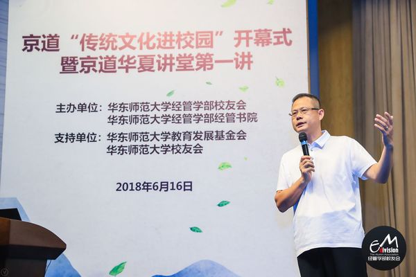 2018年6月16日,华东师范大学经济与管理学部校友师生相聚在美丽的丽娃河畔,隆重举行了京道“传统文化传播在校园”开幕式暨京道华夏讲堂第一讲活动。该项目是华东师范大学教育发展基金下的一个子项目,是由1985级国际金融校友何红章捐赠设立,下设京道茶文化研习社、京道太极拳俱乐部以及京道华夏讲堂三个栏目,旨在弘扬中华传统文化,促进传统文化在校园内的传播和发展。