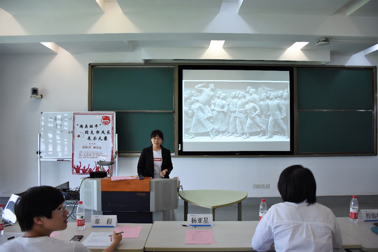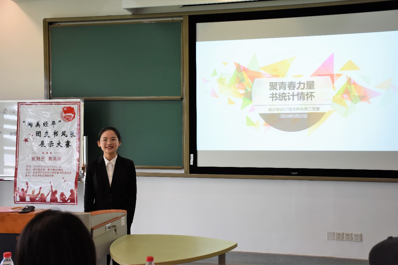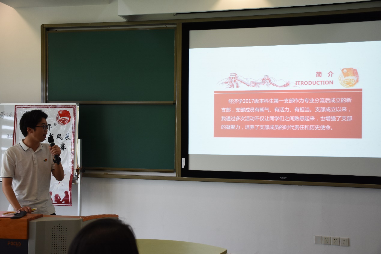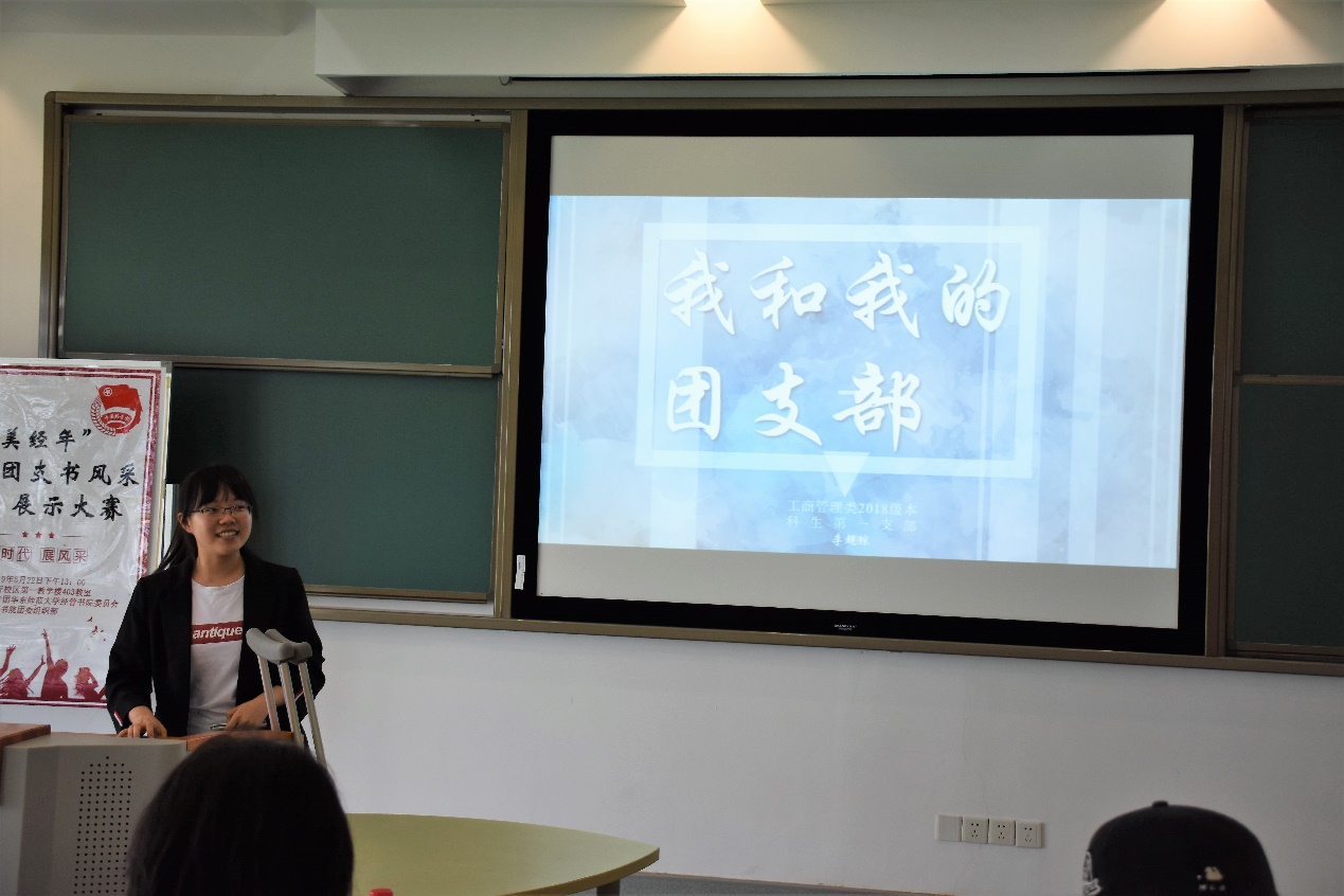 正式比赛分为两个环节。首先是“我和我的团支部”分享环节。来自经济学2017级本科生第一支部的团支部书记曹恩民介绍了“在秋风中遇见你”、“金来经往奇葩共说”、“穿越沧桑四十年”、“在春日里的遇见”和“垃圾分类,走进你心”等精彩团日活动,并支部在建设中始终注重加强对团员的思想引领,并在团日活动中彰显“经”邦“济”世的理念。来自工商管理类2018级本科生第一支部的团支部书记李超琼以颜色为主题,将黄色和活力相连结,将蓝色与文化相匹配,将红色与传承相融合,不断创新团日活动形式、丰富团日活动内容。来自统计学2017级本科生第二支部的团支部书记李铮驭也带来了所在团支部有关“先锋”建设、“青听”建设、“情怀”建设等系列活动介绍,并且提及在团日活动中注重培养团员青年的政治先进性,结合统计学专业特色,书写统计学子的独特情怀。