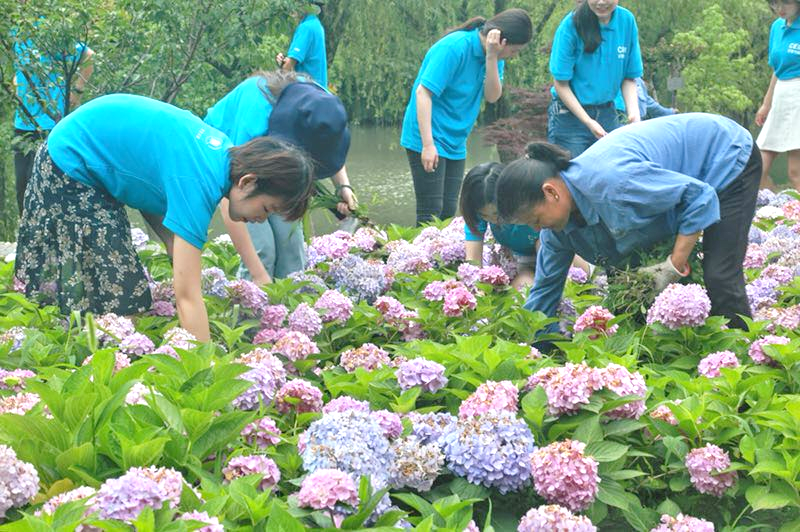 “毕业照里缤纷的花海背后原来是这样的精心呵护。”2019年6月6日上午,经管书院二十余名毕业生代表和毕业班老师、园林工人一起养护今年的毕业花——绣球无尽夏。虽然天空不时飘着小雨,同学们的衣服被雨水打湿,裤子、鞋子也蹭上了泥土,但大家热情不减,一个个弯着腰小心地拨开绣球花摘除杂草,在劳动中感受到了养护花草的乐趣和意义。此外,同学们从后勤管理老师以及园林工人的口中得知,要保持毕业季绣球花海的持续缤纷绽放,除草剪修、水肥管理等养护工作一天都不能少,大家不禁感慨劳动成果背后的艰辛。