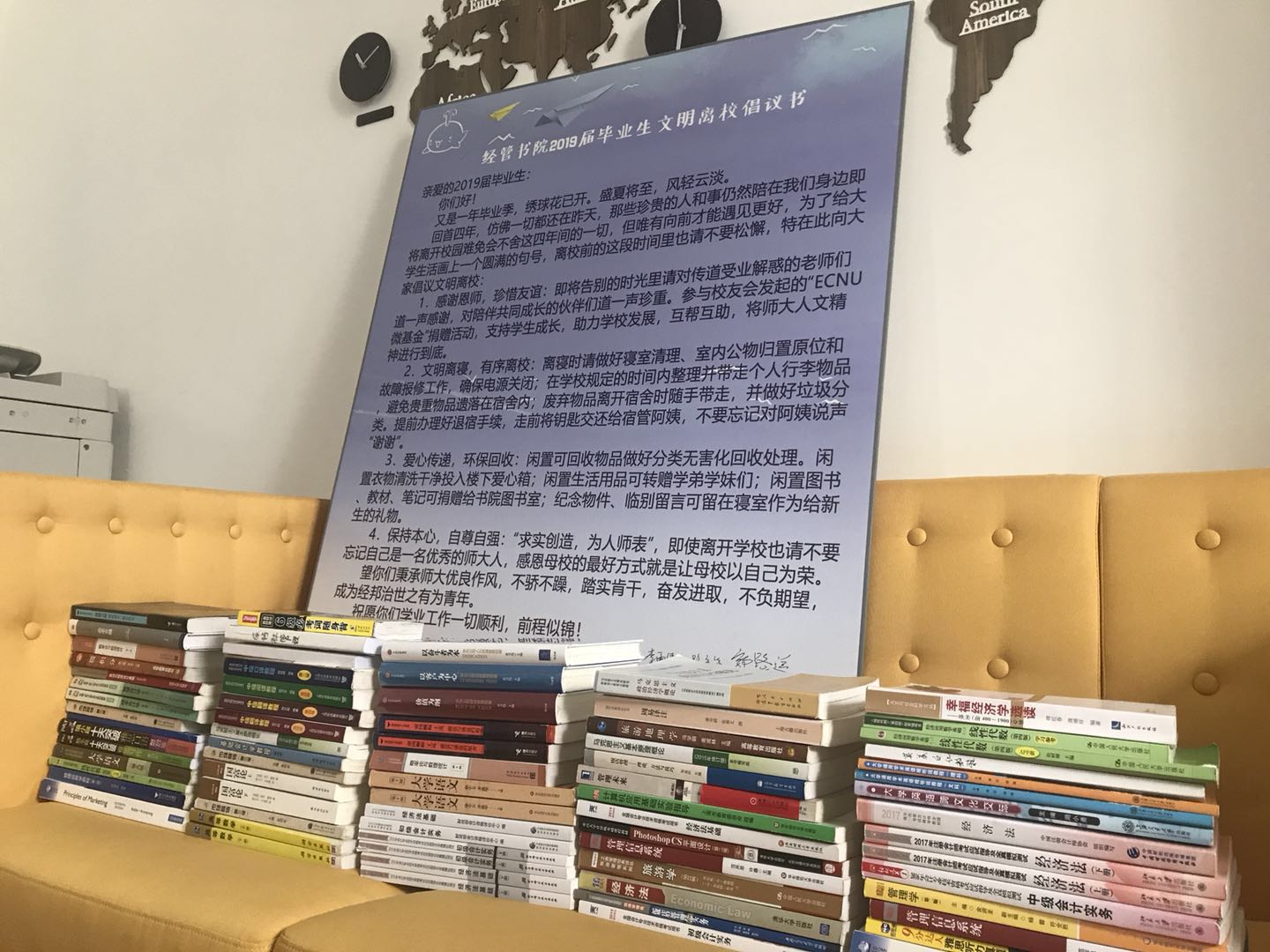 “既然带不走,就为他们找个更好的去处。”截止6月12日毕业典礼当天,经管书院社区图书室在本次毕业季共收到了毕业生近百本图书、教材、笔记,不少图书上还写了临别赠言,这些将满载毕业生的爱心传递给低年级同学。此外,毕业生们还将闲置衣物清洗干净后投放到寝室楼下的爱心回收箱,将闲置的生活用品转赠给学弟学妹们,还在寝室留下纪念小物件、新生寄语作为新生的礼物。