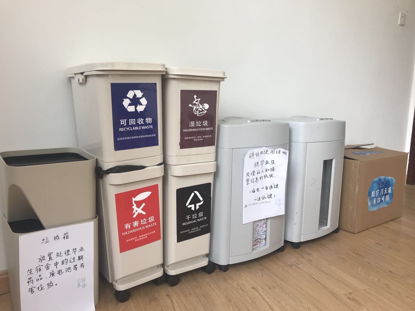 参加垃圾分类座谈会、举办分类知识竞答、走进居民社区义务宣讲、在寝室和书院社区放置分类垃圾桶……这一学期,毕业生和其他经管书院的同学们一直在为校园及周边居民社区的垃圾分类推广做努力,响应即将实施的《上海市生活垃圾管理条例》。临别之际,整理好行囊,面对一堆带不走的“垃圾”,毕业生们更是严格执行分类标准。经管书院还在社区专门放置了有害垃圾回收箱供毕业生处理过期药品、废旧电池等有害垃圾,提供碎纸机供毕业生处理带个人隐私信息的纸张,可回收垃圾也找到了妥善的去处。