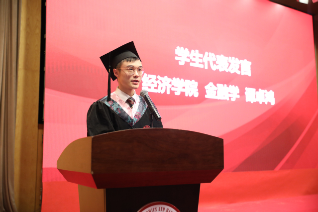 2017级经济学院的谭卓鸿同学作为毕业生代表发言。他首先回顾了自己在师大校园、经管学部学习生活的点滴岁月,代表所有毕业生,对教导关心过自己的师长和同学表达了感谢。他坚信青年人应有海纳百川的眼界胸怀,为生民立命的责任担当。自己也将继续攻读博士学位,为推动数字金融,助力经济转型升级的人生理想而不断努力奋斗。