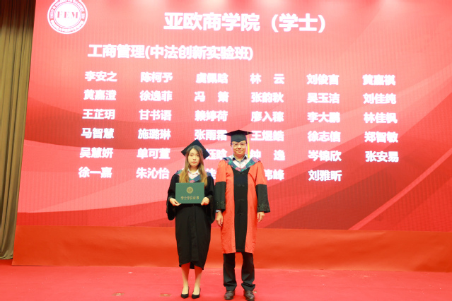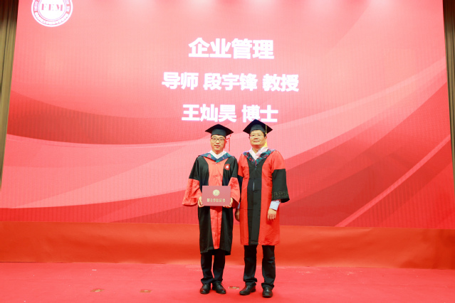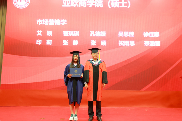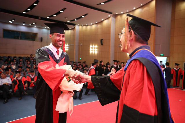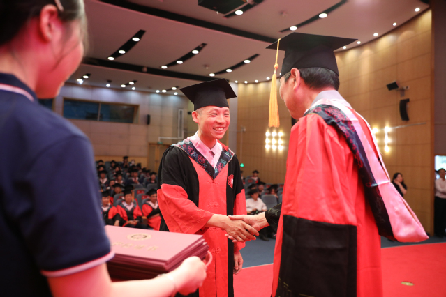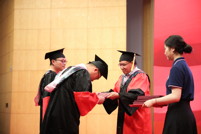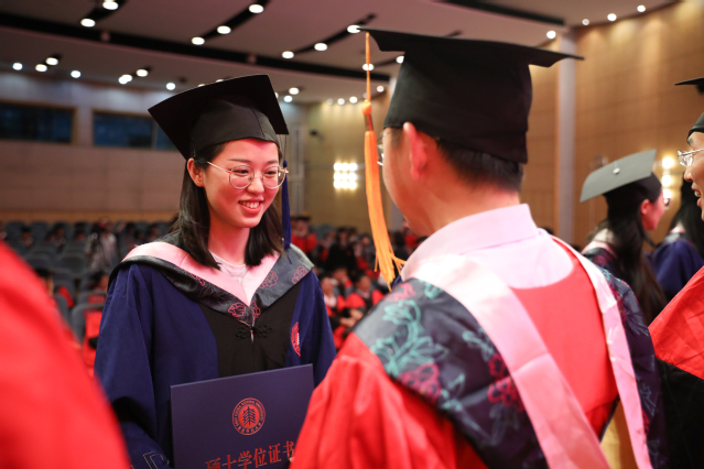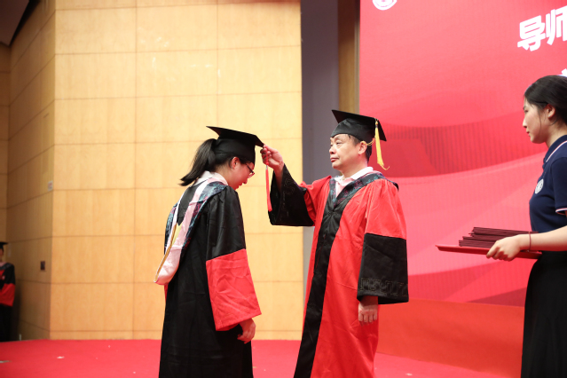 在庄重悠扬的音乐声中,毕业生代表们一一上台,与一直关心他们成长、教授他们知识的导师们握手。导师们关切地询问毕业生的去向,向毕业生颁发学位证书并拨穗留念。