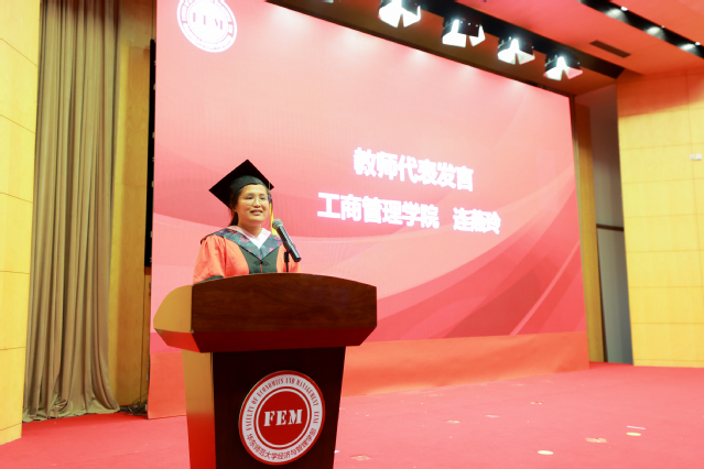 工商管理学院教师连燕玲作为教师代表发言。她表示虽然疫情给同学们的大学生涯造成了遗憾,却也让大家学会了如何直面危机、化危为机。勉励毕业们用心去感受这个时代,寻找一份真心热爱的事业,肩负起属于自己的责任担当,体验挑战和精彩,用智慧和奋斗为社会和国家做出自己的贡献。