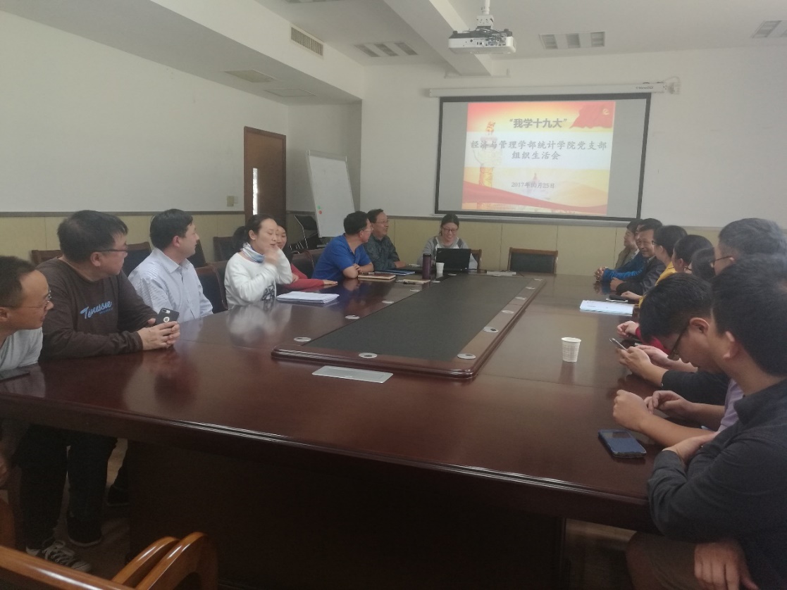 2017年10月25日下午,统计学院党支部在闵行校区统计楼103室开展了以“我学十九大”为主题的组织生活会,共同学习十九大报告和经修改通过的新党章,并交流心得。本次组织生活会由统计学院党支部书记周迎春同志主持。