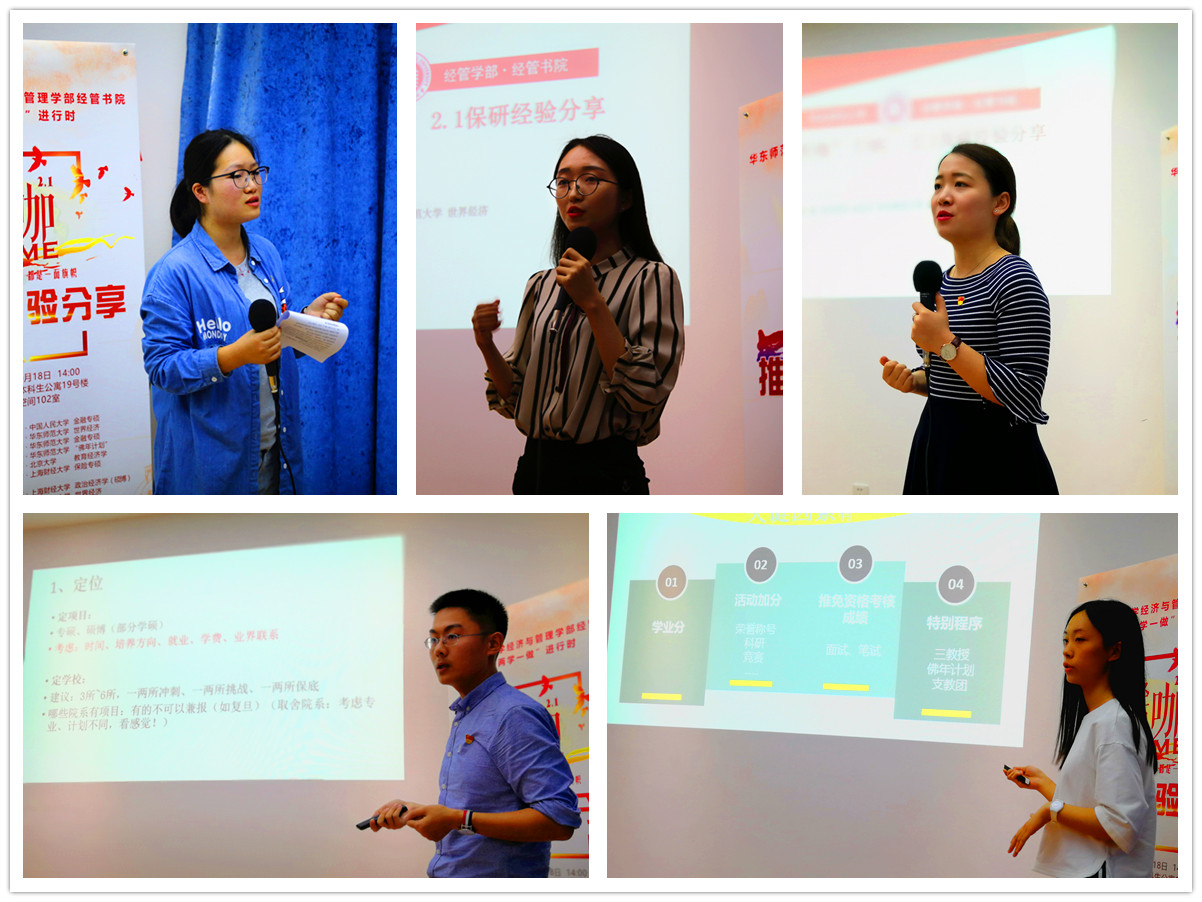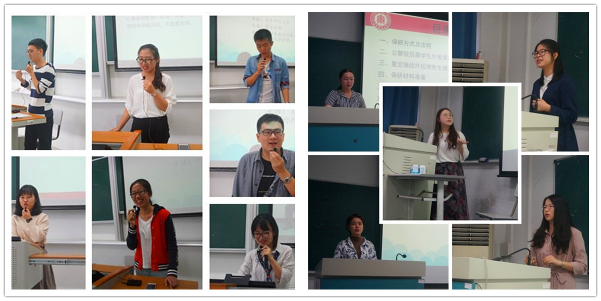 在10月11日举行的两场分享中,郎旭华、高燕丽以及保送至中国人民大学房地产经济与管理的张志开(中共党员)、本校金融专硕的彭斐然(中共党员),和复旦大学企业管理的陆诗怡(预备党员)、复旦大学行政管理的王叶青(预备党员)、同济大学公共管理的赵宇婷(预备党员)、中国科学院大学科技管理的唐家蕙、本校企业管理的施佳庆(预备党员),以及部分团员同学在两个校区从不同的侧重点分别分享了各自的保研经验。