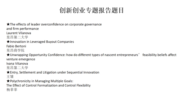 19日下午,专题讨论会在华东师范大学亚欧商学院大楼举行,在 “创新”、“金融”与“市场营销”三个分会场,与会嘉宾分别就自己的论文进行报告和小组研讨。本次讨论会共有17场学术报告举行,吸引了来自亚欧商学院及经管学部其他院系的研究生和本科生旁听及参与讨论。