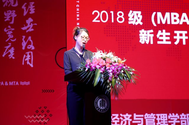 经济与管理学部党委书记岳华教授在随后的致辞中,介绍了学部的历史沿革、组织架构和师资力量,并且充满情怀与激情地向新生们传递了两点期望:一是成为一个常怀希望的正能量的人;二是要有家国情怀,不仅要着眼于个人的发展,更要成为国家未来的见证人与建设者。同时作为MBA的前线教学老师,岳华教授表示期待与同学们在课堂上,讨论时、论文指导中相遇,诚挚祝福新生们都能勤奋学习、愉快生活、开阔视野、成就理想,获得了现场的热烈掌声。