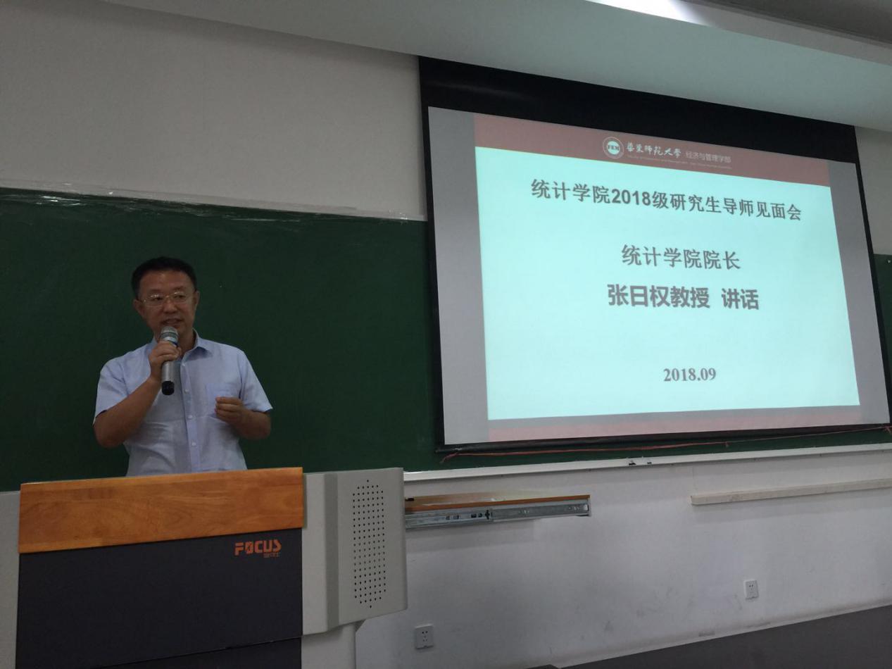 统计学院张日权院长进行了讲话。他首先代表学院全体教师向2018级研究生新生的到来表示最热烈的欢迎。接着他从学科水平、历史发展、资源平台、专家团队、师资力量等方面详细的介绍了统计学科的过去,现在和未来。最后他对研究生新生提出了殷切希望:希望他们不仅要汲取知识,还要学会探索研究;不仅学有所成,还需保持健康的身体;不仅学习统计精神,还能将其传承和发扬光大,并希望同学们在华东师范大学统计学院成就更好的自己。