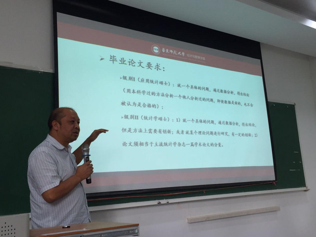 接着,统计学院副院长、统计与精算学系系主任吴贤毅教授向同学们讲解了学业上的相关注意事项。他从导师选择,毕业论文要求,讨论班,实习等几个方面将同学们今后可能遇到问题进行了详细讲解,语言幽默风趣,使人记忆深刻。最后,他逐一介绍了学院每位老师的教育、工作经历,研究方向和学术成果等,为同学们学业进步和选择导师提供了很好的帮助。