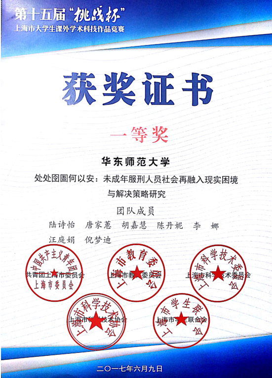 2017年6月10日,由共青团中央、中国科协、教育部、全国学联和上海市政府共同主办的第十五届“挑战杯”上海市大学生课外学术科技作品竞赛在上海工程技术大学隆重举行。2014级人力资源管理专业本科生陆诗怡、唐家蕙、胡嘉慧等同学的项目《处处囹圄何以安:未成年服刑人员社会再融入现实困境与解决策略研究》(指导教师:公共管理学院曲如杰副教授、李悦老师)获得了本届“挑战杯”上海市大学生课外学术科技作品竞赛“一等奖”。该项目以国务院及各部门对为未成年管教工作试点工作为背景展开,研究着眼于未成年服刑者的社会再融入,通过对上海市未成年服刑者、上海市未管所内狱警、再犯罪的原未成年服刑者及社会大众进行访谈和发放问卷,全面了解未成年服刑者社会再融入情况,并结合文献成果分析未成年服刑者社会再融入过程中存在的现实困境,同时从个体因素与外部因素两方面分析其影响因素,并在已有的数据分析基础上,提出了切实有效的策略与建议。