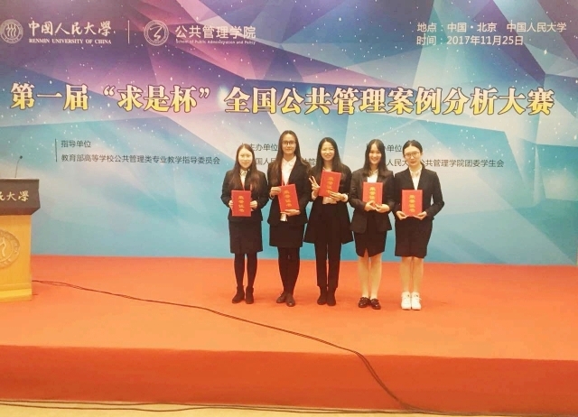 2017年11月25日,由教育部高等学校公共管理类专业教学指导委员会主办的首届“求是杯”全国公共管理案例分析大赛,在中国人民大学举办。2014级本科生陆诗怡、施佳庆与2015级本科生陈梦瑶、王浩昕和汪昕炜组建的华东师范大学代表队,在公共管理学院李悦老师的带领下,取得大赛“第二名”的佳绩。全国260多支参赛队伍参与了本次赛事,其中24支队伍赴京参与复赛。复赛中,我校与复旦大学、上海交通大学、武汉大学等同一小组竞技,并以总分第一的成绩顺利晋级。半决赛中,我校展示了《拿捏之度:网约车包容审慎型治理的行动策略模型构建——基于上海市实证研究》案例分析报告,并进行了精彩的答辩,最终与主办方中国人民大学会师决赛,取得了亚军的好成绩。此次大赛旨在促进高校学生积极投身公共管理实践,提高发现问题、分析问题、解决问题的能力,为公共政策制定和国家治理建言献策。