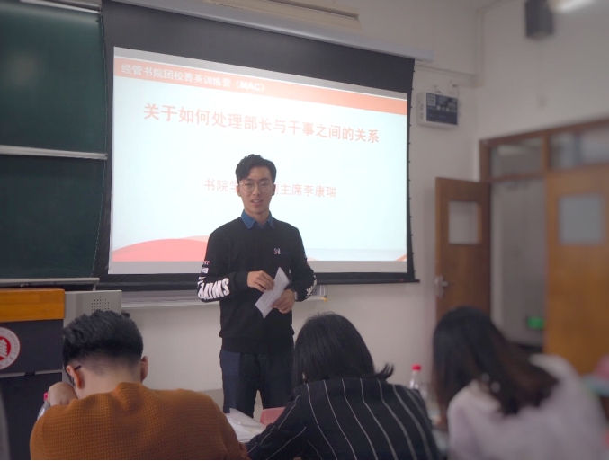 经管书院学生会副主席李康瑞就处理部长与干事之间的关系、如何营造良好的部门文化氛围作了经验分享,他认为真实感与位置感需要共存,学会换位思考、安排任务与经营自己是十分必要的,他对两年的学生会工作经历做了一个总结:它让你变得沉稳、温柔,而不是圆滑世故,让你破碎不足,重建修正,而非在认清事实之后埋怨、躲避、退却。恳切的话语鼓舞人心,激励着学员们成为更好的自己。