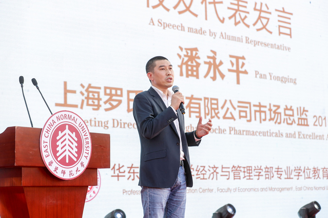 MBA2015级校友代表、罗氏制药有限公司市场总监潘永平向2020级新生学弟学妹们分享了深刻的人生感悟。他以视频网站bilibili的发展轨迹为导入,切回自身所在的医药行业的转型需求与人才需求,凸显了突破舒适区,敢于求变的主题。面对瞬息万变的时代变局,他总结了这个时代对专业人才与跨界人才的需求,并与新生们共勉:以足够的勇气去涉猎更多,以足够的好奇去探索世界,以成长型的思维去挑战自己,以更开阔的视野去进行交流,以此迎接一个终身学习的时代。