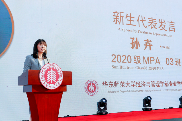 新生代表、MPA孙卉同学代表全体新生发表了入学感言。极不平凡的2020年,经历诸多困难与不确定性,令来到华东师大求学的机会更显珍贵。孙卉同学回溯了自身在工作经历中的瓶颈困惑、分享了决定重回校园的心路历程,更明确了自身肩负的重要责任,表达了将会”积极平衡工学矛盾、兼顾好家庭和学业、保持内心的稳定和行为的专注、珍惜难得的学习机会”的决心和信念。在之后两年半的时间里,与同学相识相知,携手前行,开始新的乘风破浪之旅。